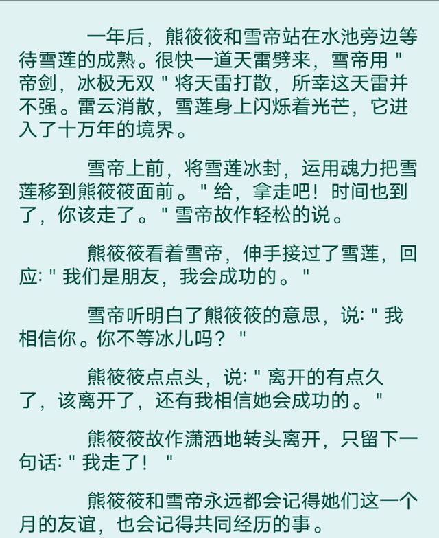 熊筱筱到了星斗大森林,第一件事就是先去找生命之湖,帝天和碧姬正巧在生命之湖旁边腻歪。两兽看到筱筱回来了,立刻分开。帝天咳嗽了两声,碧姬脸上的红晕还没有消去,说:“筱筱,你回来了!这一路怎么样?顺不顺利?”