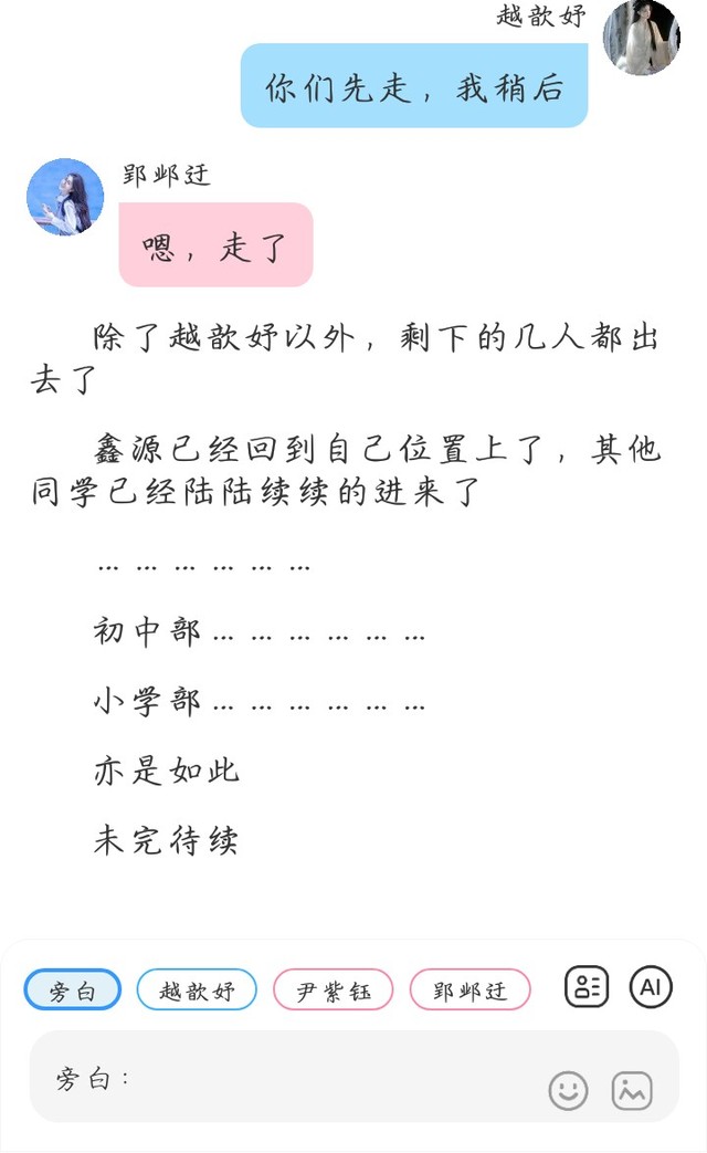 越歆妤(看着班级里的人都进来了,对后面站着的人说)你们几个怎么又站着去了,回坐位去