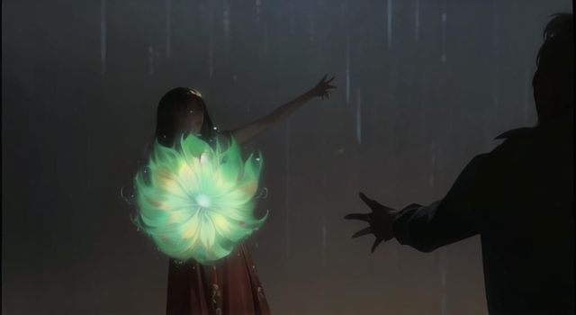 里斯真身站在芙洛媞身边,他的手轻抚着芙洛媞的脸,这不过现在,他们相爱难相见啊…