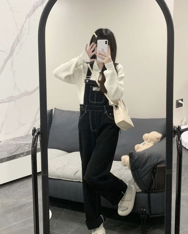 你化好妆后,从衣柜里拿出了一件小背带裤散着头发,看起来还不错!