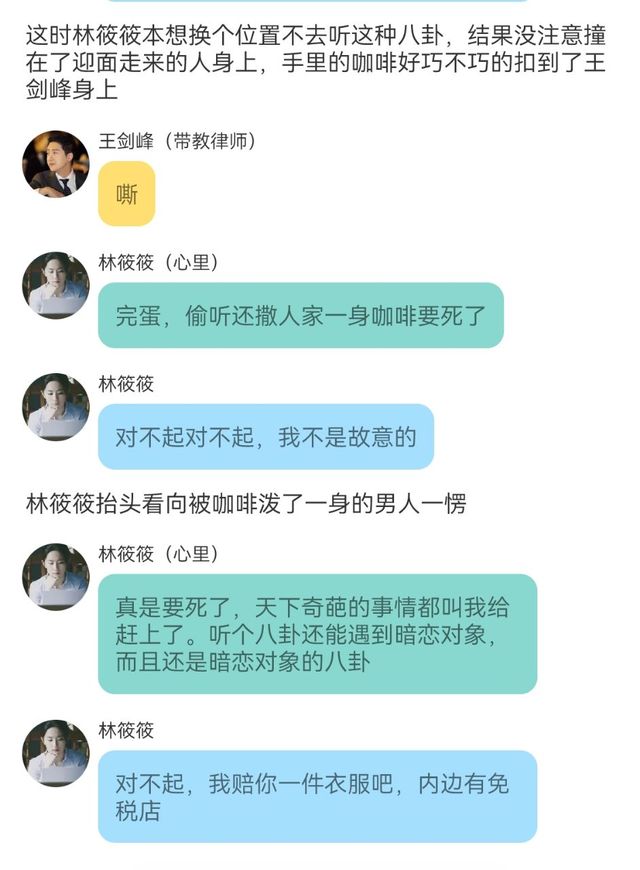 王剑峰(带教律师)小丫头你刚刚小声嘟囔的话别以为我没听到,紧接着就泼我一杯咖啡