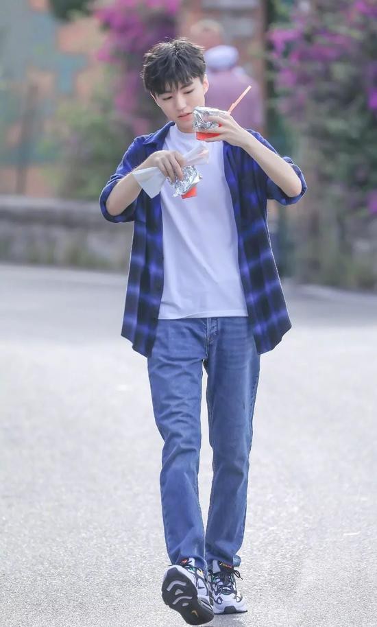 刚下飞机王俊凯把行李放房间了,又换了休闲装和拿了一个外套和土力架
