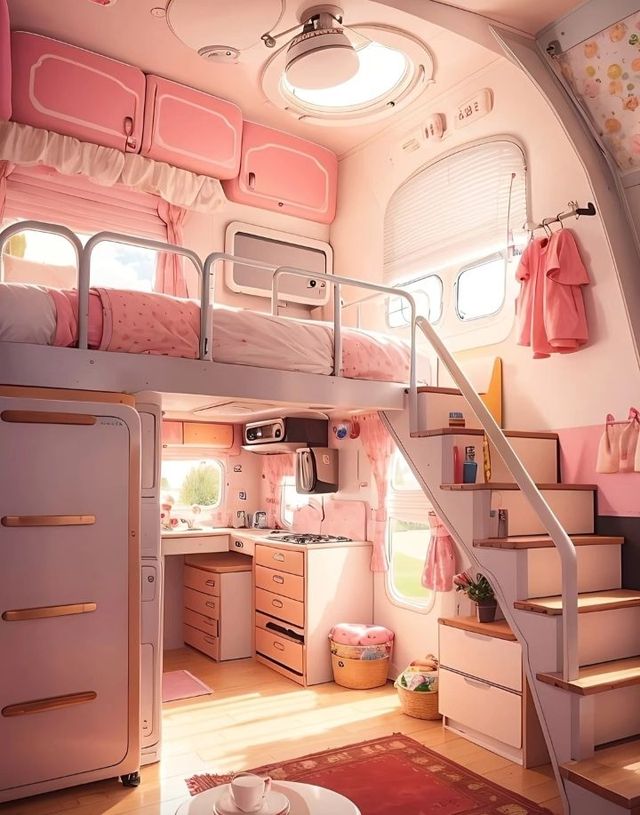 房车内部是天蓝色的调调,整个一个小复式结构。