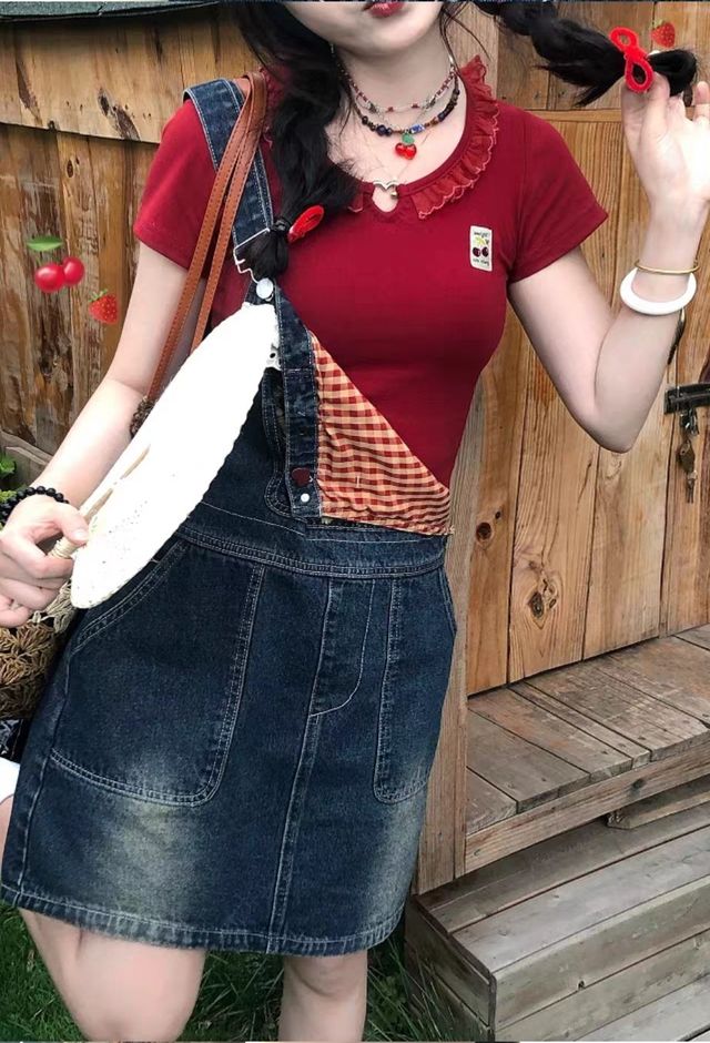 梨歌一身红色露脐短袖,外面是牛仔背带裙