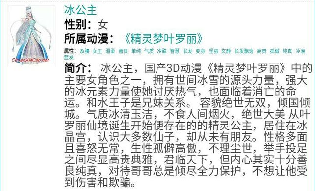 简介:冰雪公主,女主角之一,拥有世间冰雪的源头力量,强大的冰雪元素力量使她最最讨厌热气,也面临着消亡的命运。和雪公主和冰公主是姐妹关系,有哥哥水王子。容貌绝世无双,倾国倾城。气质冰雪清玉洁,不食人间的烟火,绝世大美从叶罗丽仙境诞生开始便存在的精灵公主之一,居住在冰雪晶宫,认识大多数仙子,却从未有过朋友。性格因此变得多面且喜怒无常,生性孤单高傲,不理世间尘世,举手投足之间尽显高贵优雅,君临天下,但内心其实十分善良天真,对待姐姐哥哥总是倾尽全力的保护,不想让任何人去伤害她们,不让她们受到任何的伤害和欺骗。