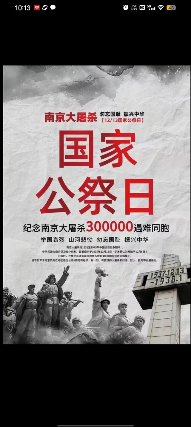 苏柠熙历史上的今天,1937年12月13日,侵华日军铁蹄踏破金陵城,长达六周的屠城惨案将30万同胞的生命永远定格在寒冬,拉贝的日记、马吉的胶片、程瑞芳的文字为这段反人类罪行留下铁证;八十余载岁月流转,警报长鸣从未停歇,我们铭记这段民族伤痛,不是为了延续仇恨,而是以“昭昭前事,惕惕后人”的敬畏守护和平,让中华民族任人宰割的屈辱历史永不重演,向英雄敬礼向30w同胞默哀