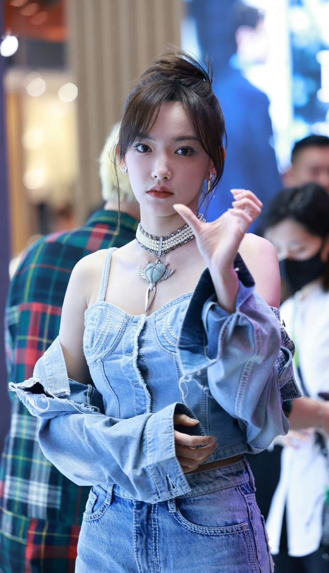 (牛仔吊带和牛仔外套,加上一双白色运动鞋)