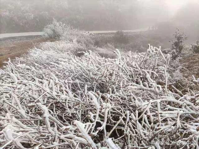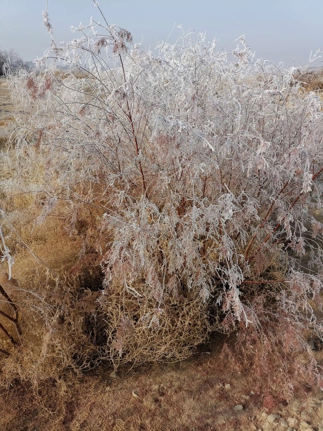 妆扮成了冰晶玉洁的少女。再走近些,一朵朵霜花黏附在枝枝叉叉上。