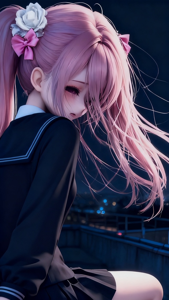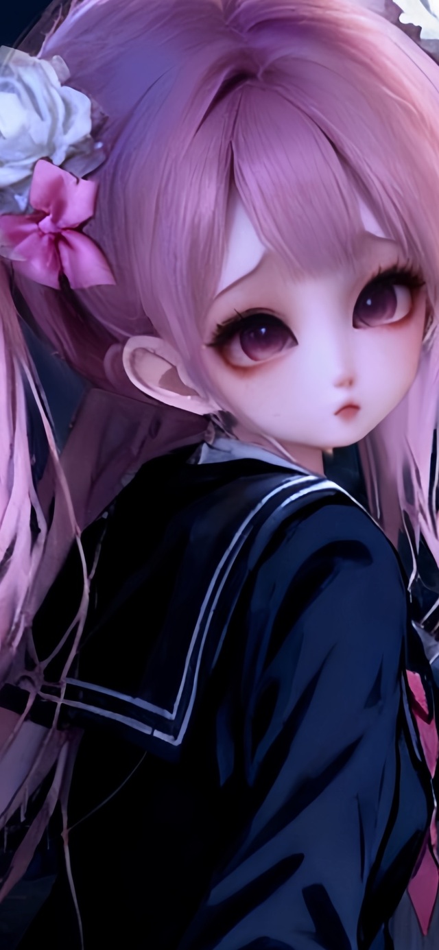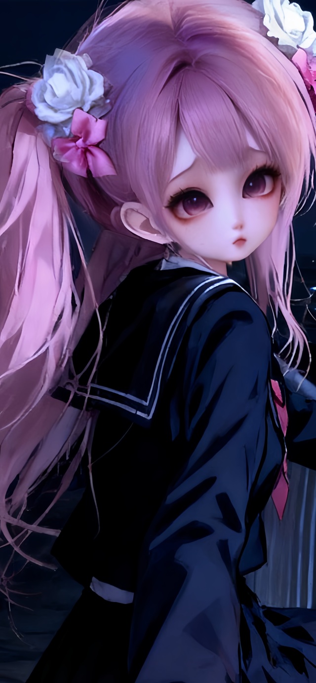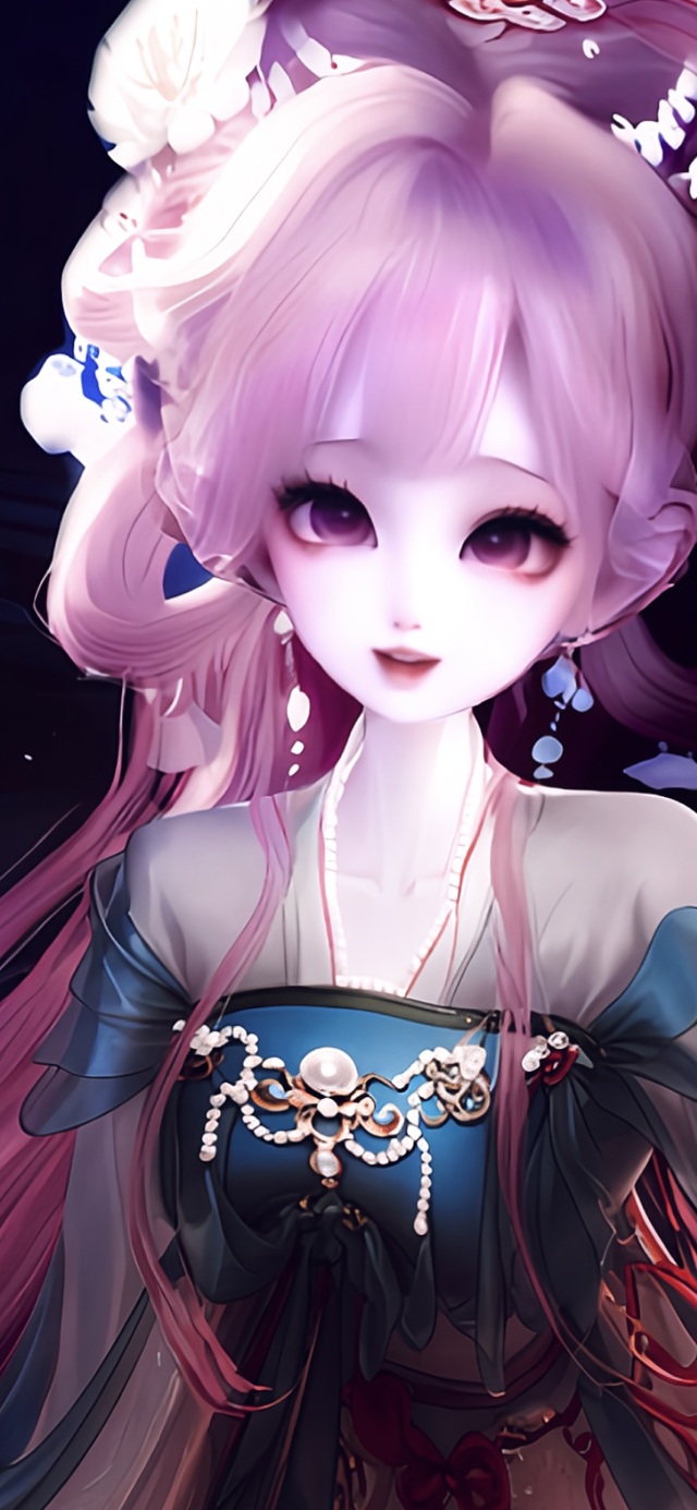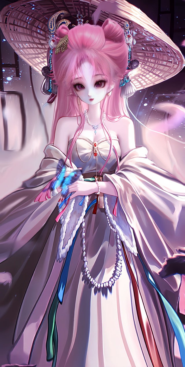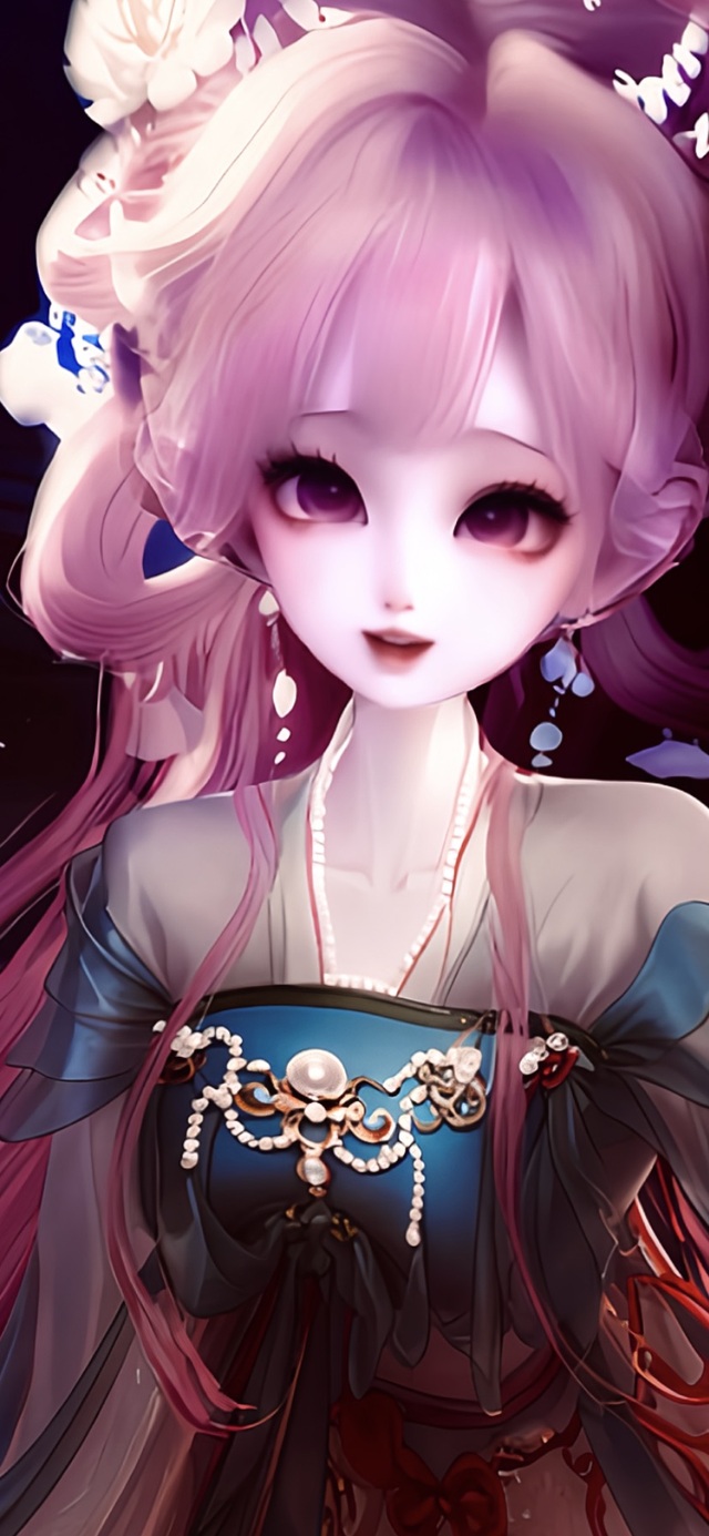 她静静立在那里,仿若从缥缈仙境降临凡尘。那一头淡粉色长发如云雾般轻柔,发间的白花与珠翠发饰相互映衬,恰似春日枝头初绽的芳菲。头顶那枚缀着珍珠的蝴蝶结发饰,更添了几分俏皮与灵动,却又无损她周身的出尘气质。