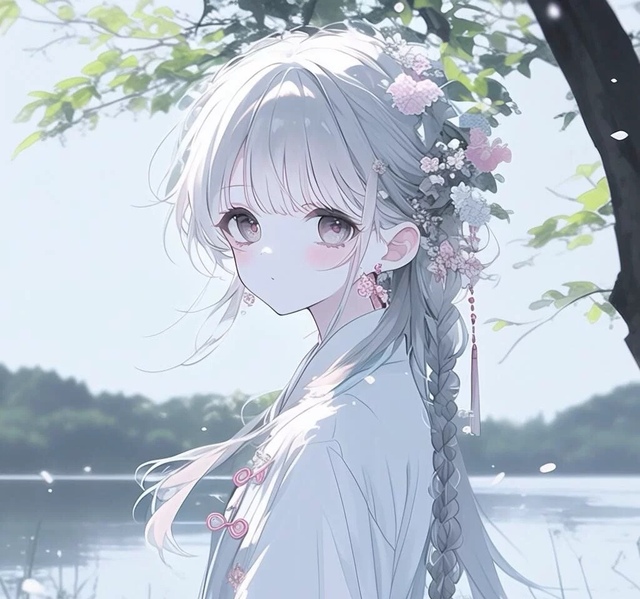 一头银白色的长发如月光下的流水般倾泻而下,巧妙地编织成两条优雅的辫子垂落在肩头。发间点缀着几朵小巧精致的花饰,以及星星点点的粉色配饰,在阳光下闪烁着梦幻般的光芒。耳畔悬挂着一对精致的耳环,随着她的动作轻轻摇曳,增添了几分灵动之感。身穿一袭白色的衣裙,上面绣着细腻的粉红花纹,胸前系着一个可爱的蝴蝶结,既显现出少女的纯真可爱,又不失那份独有的高贵气质。她的面容清秀,五官精致,尤其是那双清澈见底的大眼睛,眼眸呈现浅棕色或淡紫色,仿佛能洞察人心的秘密,却又能给予人无限温暖与安慰。此刻,她正以一种温柔而又平和的表情凝视着前方,嘴角微微上扬,似乎在回味着什么美好的回忆。背后,则是一片宁静的湖水与郁郁葱葱的树林相互辉映,营造出了一种远离尘嚣、静谧祥和的氛围。这幅画面不仅让人感受到了自然界的和谐之美,也仿佛能够听到微风拂过水面时的细语,闻到空气中弥漫着的清新花香,令人沉醉不已。