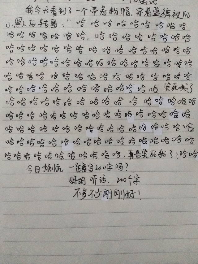 我今天看到了一个带着粉帽,穿着裤衩的小黑人在转圈:哈哈哈哈哈哈哈哈哈……(此处省略一百七十字哈哈哈)真是笑死我了!哈哈!