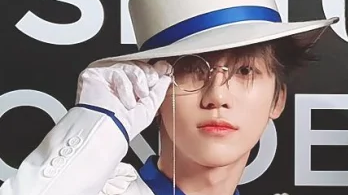 白色西装衬得他身形修长,礼帽下微卷的黑发与若隐若现的耳饰更添几分矜贵感,而单片眼镜的反光设计则巧妙遮掩了部分眼神,既呼应了怪盗“不可捉摸”的特质,又为粉丝留足想象空间——仿佛他下一秒就会以魔术师的手法偷走观众的心。