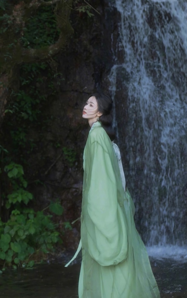 沈璐桦一袭浅绿色薄纱汉服,乌黑的长发随风飘散破碎感拉满