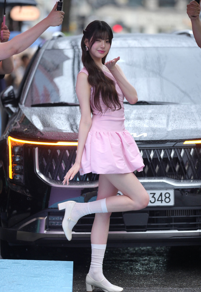 孟溪穿着一条粉色公主裙,发型是半扎发,很甜美。