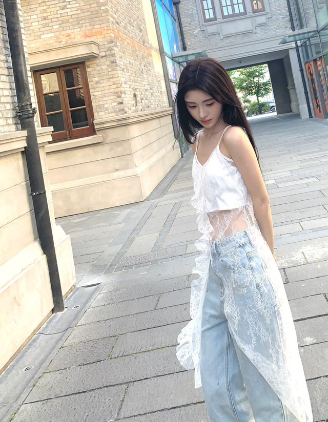 她穿一件不规则蕾丝吊带裙,搭蝴蝶亮片牛仔裤,细细的腰露出来。