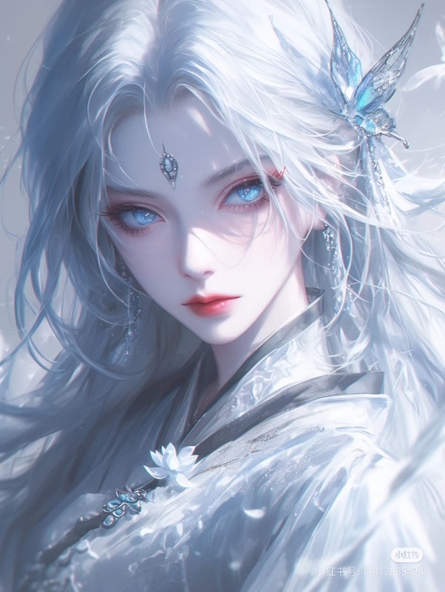 她如霜雪凝成的仙姿,白发似流瀑,几缕轻扬,添了灵动。额间银饰缀着细碎光,如星落眉心。双眸是澄澈冰湖,泛着幽蓝,藏着清辉与疏离。