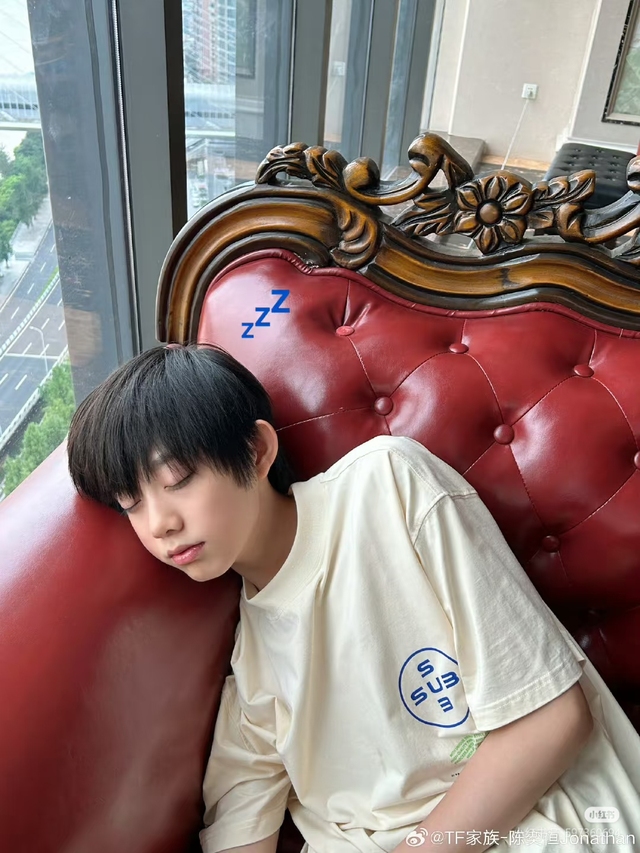 陈奕恒因为有些晕车,就在上车没多久就睡着了。左奇函在等红绿灯🚥的时候,发现陈奕恒睡着了,偷偷拍了一张,发给张桂源