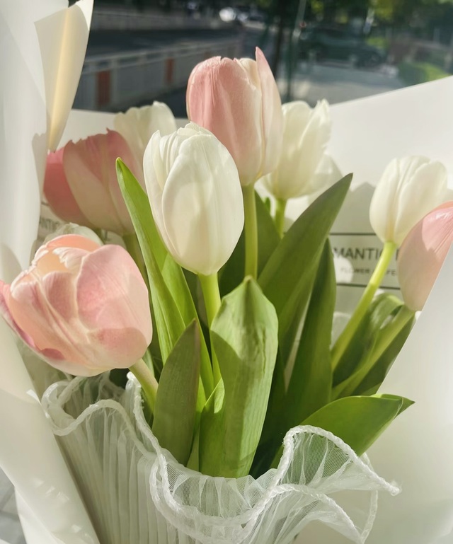 我这才看到他手上拿着一束郁金香和一个小袋子