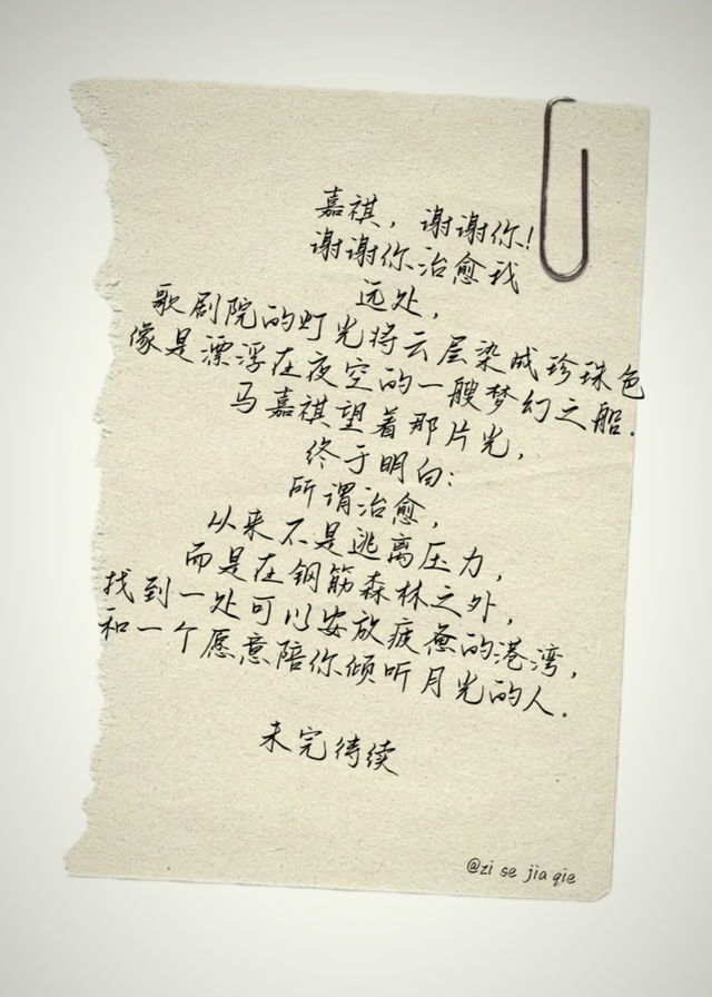 远处,歌剧院的灯光将云层染成珍珠色,像是漂浮在夜空的一艘梦幻之船。马嘉祺望着那片光,终于明白:所谓治愈,从来不是逃离压力,而是在钢筋森林之外,找到一处可以安放疲惫的港湾,和一个愿意陪你倾听月光的人。