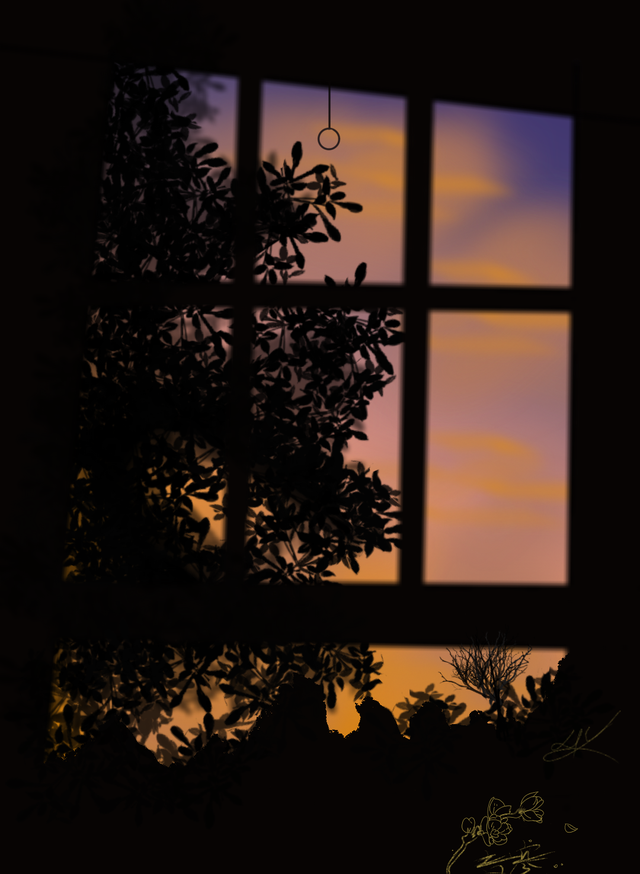 眼前是一幅静谧的黄昏画卷 咕噜一声咽下一口唾沫 主角怔怔望着那抹渐渐西沉的落日 余晖把窗边一排不知名的小树镀上一层金边 树影婆娑在地面上摇曳生姿 影影绰绰 老旧的窗帘拉环随着微风轻轻碰撞发出叮叮的脆响 一拉就能下来的简单设计透着几分随性 远处连绵的小山起伏有致 近处一棵枯树枝倔强地指向天空 似乎在诉说着什么故事。。的一种感觉 。