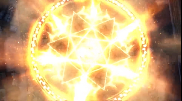屋子废墟里,地面闪起一道金光多角星形,整个房屋开始震动起来,随时都要坍塌
