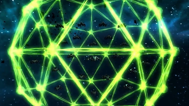 敌方战舰同时发射激光炮集体攻击玄武号,绿色的能量保护罩抵挡住了这些发射而来的激光