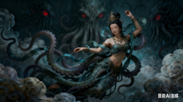 他将传统飞天形象与克苏鲁元素大胆结合: