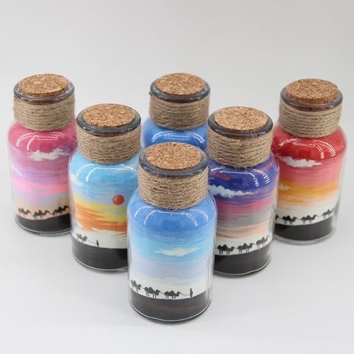 这些玻璃瓶中装着敦煌五色沙,在灯光下闪烁着细碎的光芒。