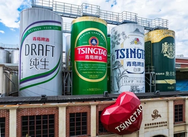 青岛啤酒博物馆的灯光将十杯啤酒照得晶莹剔透,