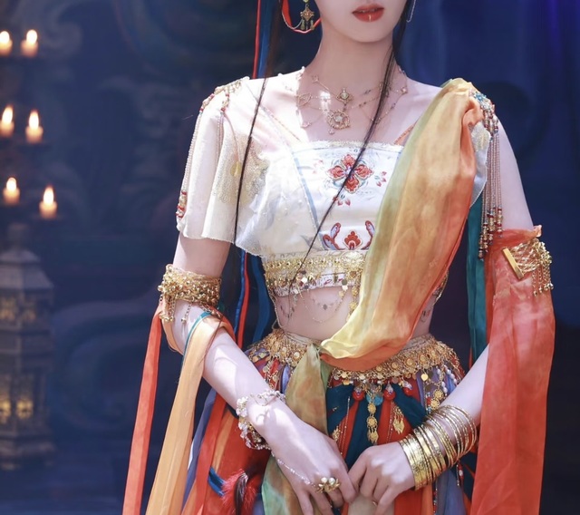 岳凝穿着橙色金丝纱裙,绣着精美绝伦的图案,彩色的丝带系在腰间,随风飘动,撩人心弦。