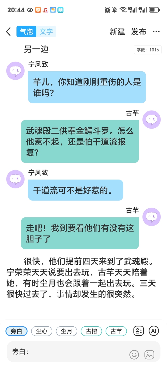 第四天,古芊因要跟宁风致谈论明天如果武魂殿用强来逼迫各大宗门怎么办,让尘月和两位爷爷陪宁荣荣。可刚谈到一半,尘月跑了回来,古芊一见只有她跑了回来。