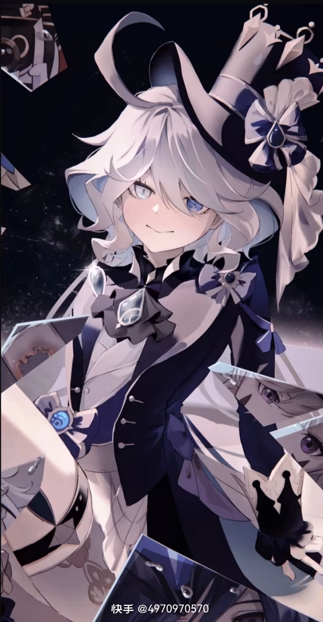 再在发顶上加上一撮跟芙宁娜一样的呆毛。头上斜戴着皇冠样式礼帽。也是跟芙宁娜一样。