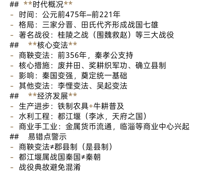 5. 时代区分:战国是东周后期,并非独立朝代;封建制度确立是各国变法的共同作用,商鞅变法是其中最彻底的推动