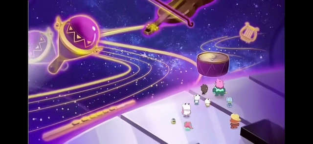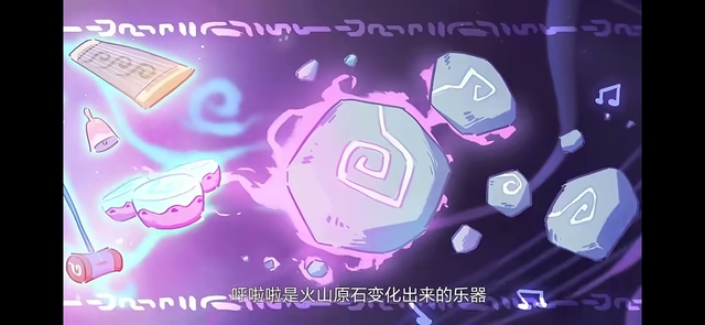 随着他们来到一个奇异的空间,那个空间特别像外星,空中漂浮着许多乐器,还有许多火山原石飘浮在空中