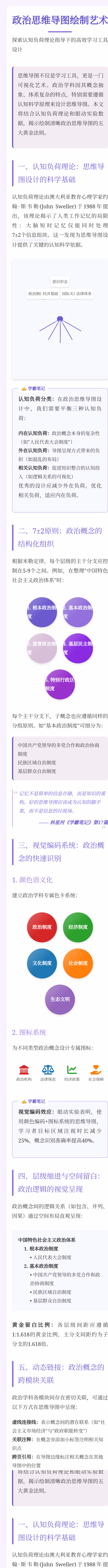 思维导图不仅是学习工具,更是一门可视化艺术。政治学科因其概念抽象、体系复杂的特点,特别需要遵循认知科学原理来设计思维导图。本文将结合认知负荷理论和眼动实验数据,揭示绘制清晰政治思维导图的五大黄金法则。