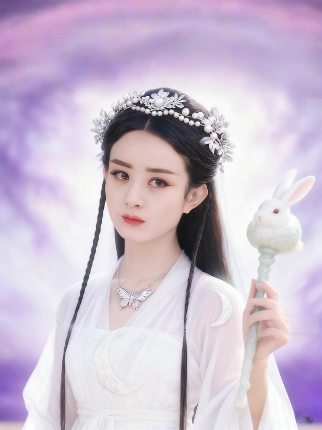 紫霭氤氲中,她独立云间,目光温柔却带着无法触及的疏离。那是看尽人间冷暖,历经沧海桑田后的宁静祥和。她不再是凡俗中人,而是月宫之主,守护着亘古不变的神话传说。