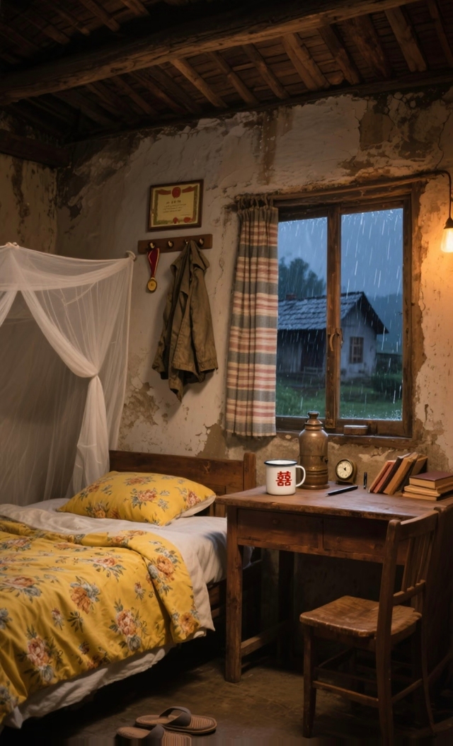 她用随身带的毛巾擦了擦头发,然后坐到床沿。床铺是硬的,铺着厚厚的稻草垫子,上面是粗布床单,被子摸起来是硬挺的棉絮,有阳光晒过的干燥味道,但也混合着一丝淡淡的、属于男性的、类似皂角和汗水交织的气味。这气味并不难闻,却让她脸颊微热。