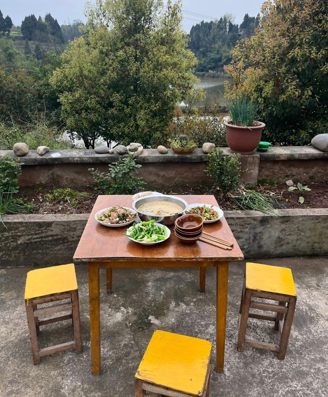 蔚瑾跟了进去。厨房果然狭窄,但收拾得异常整齐。灶台擦得干净,柴火堆在墙角,码得整整齐齐。一张矮小的方桌摆在靠窗的位置,桌上已经摆好了碗筷:两碗冒着热气的粥,金黄油亮,是玉米碴子混着小米煮的;一碟黑乎乎的咸菜,切成了细丝;还有一小盘金黄色的、边缘微焦的贴饼子,散发着粮食特有的朴素香气。