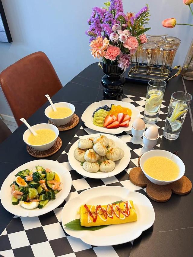 两人起床收拾妥当后,一转身便见桌上已摆满了各式各样的早餐,香气扑鼻而来,令人食指大动。而阿姨正忙碌于厨房之中,手中动作轻柔地将热腾腾的粥盛入碗中,那细腻的动作仿佛对待一件珍贵的艺术品。