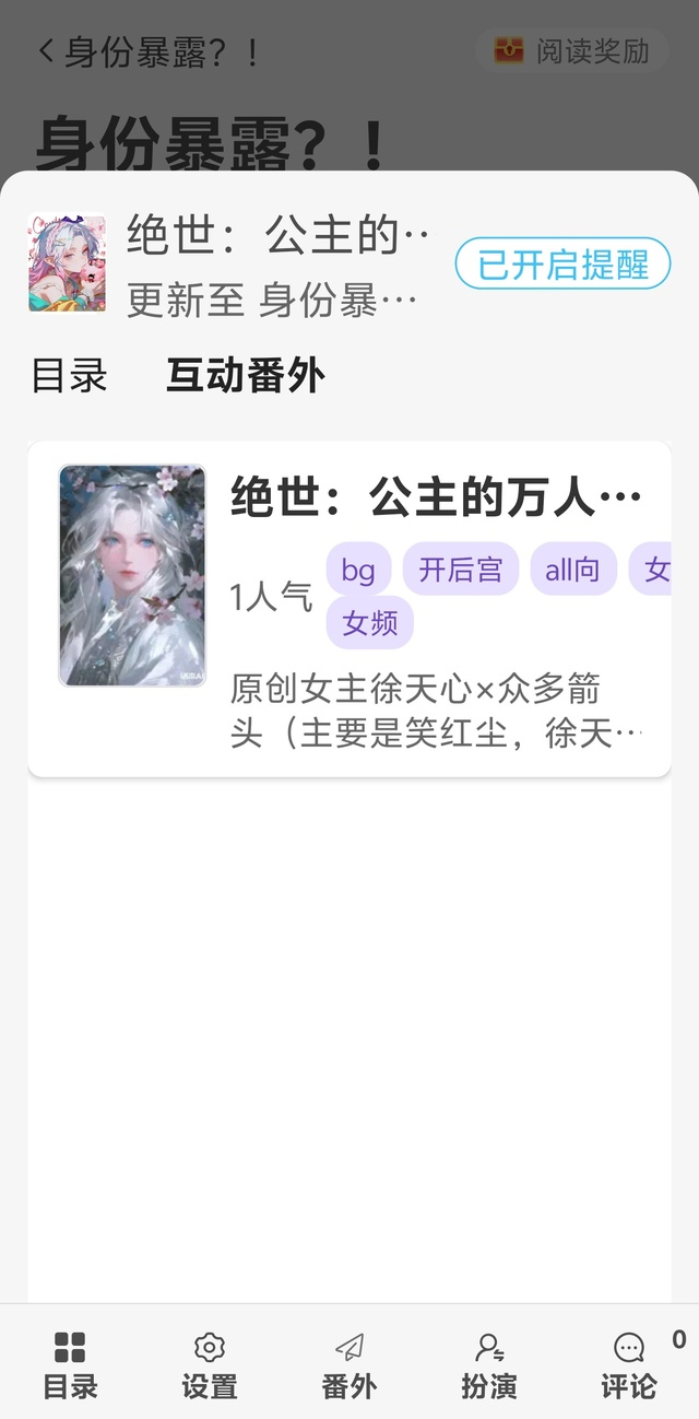 作者搞了一个互动番外,采用了一些本文和原著的设定。当然内容和正文没关系,但是可以通过自己点击选项然后生成后面的情节,还可以回溯到最初的序章重新生成内容,感兴趣的宝宝可以试试。