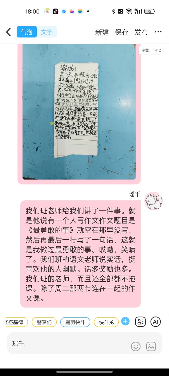 瑶千我们班老师给我们讲了一件事。就是他说有一个人写作文作文题目是《最勇敢的事》就空在那里没写,然后再最后一行写了一句话,这就是我做过最勇敢的事。哎呦,笑喷了。我们班的语文老师说实话,挺喜欢他的人幽默。话多奖励也多。我们班的老师,而且还全部都不拖课。除了周二那两节连在一起的作文课。