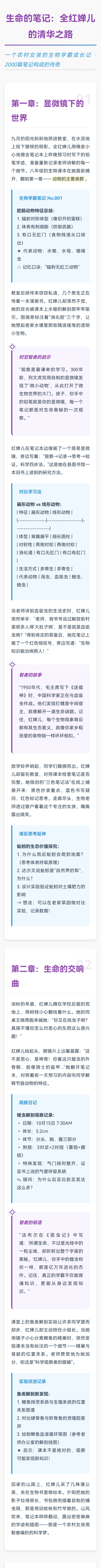 当老师讲到血吸虫的生活史时,红婵儿突然举手:"老师,我爷爷说过解放前村里很多人得'大肚子病',是不是就是血吸虫病?"得到肯定的答复后,她在笔记上画了一个红色惊叹号,旁边写道:"生物知识能治病救人!"