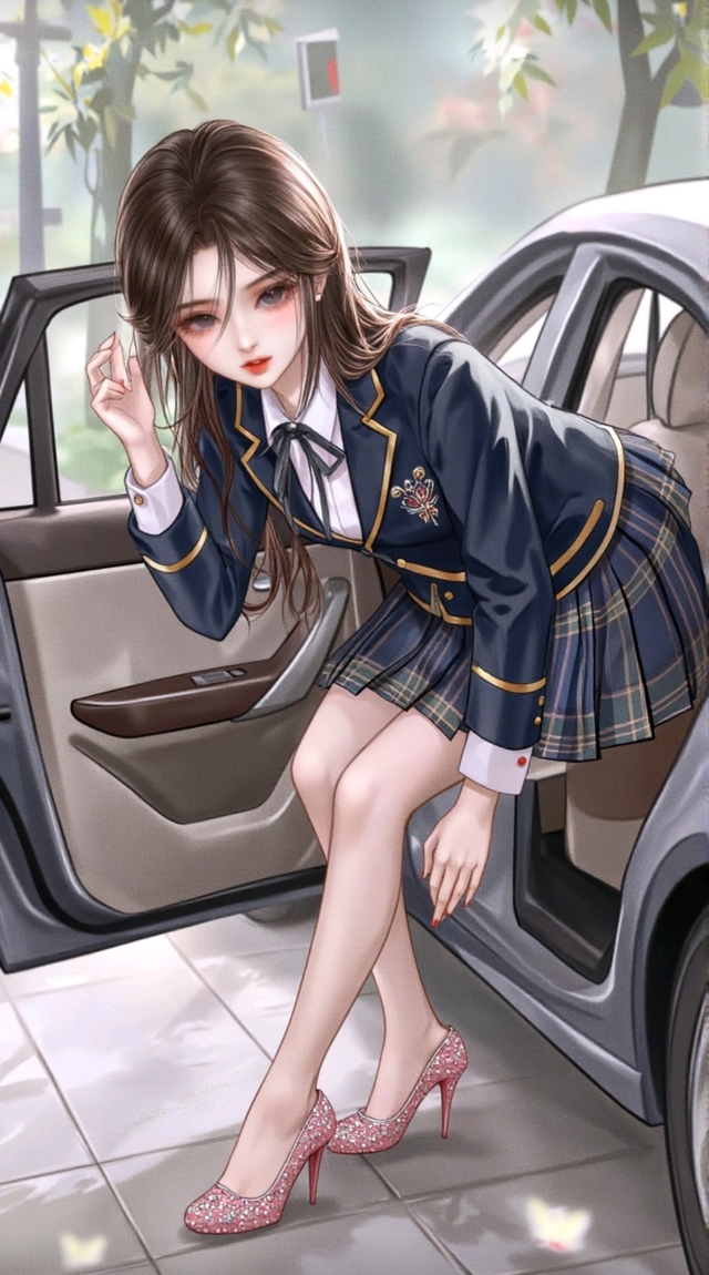 一只镶嵌着粉色钻石的Christian Louboutin高跟鞋踏出车门,随后是纤细的脚踝和娇小玲珑的身影。