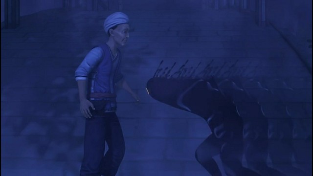 更夫突然转过头看着辗迟,更夫满脸狰狞,凶狠无比,辗迟被吓到,一直往后退