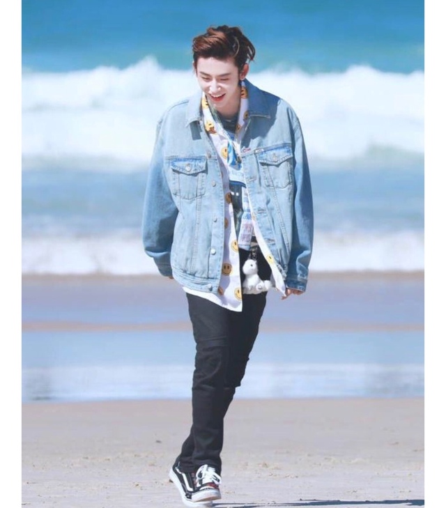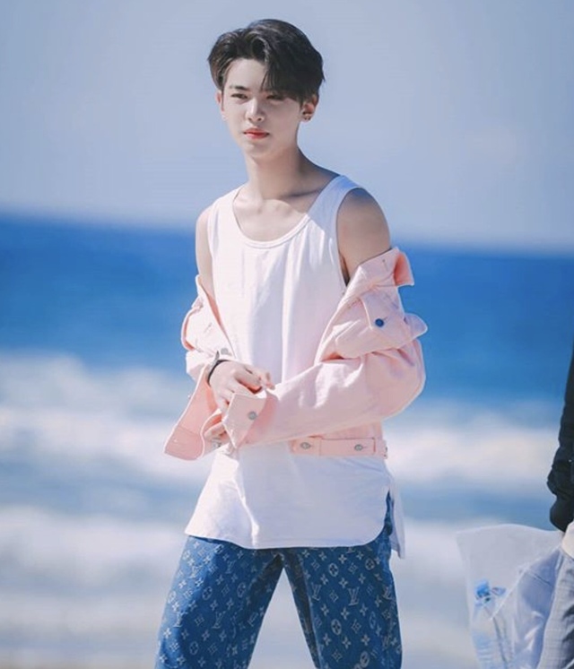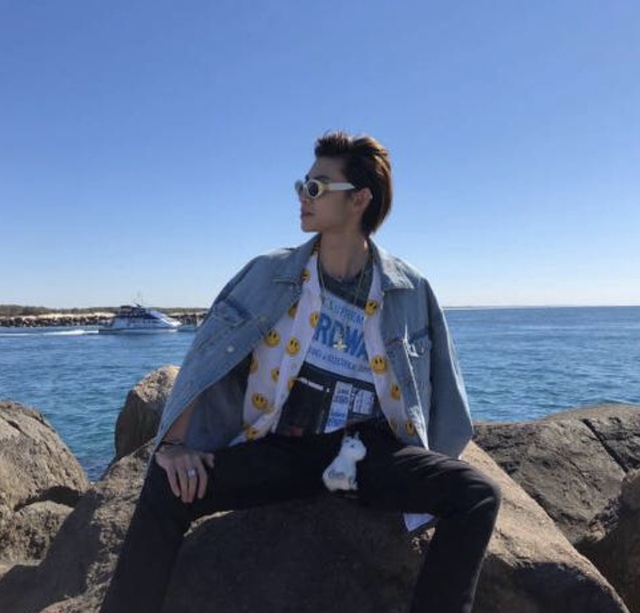 Justin穿著吊嘎背著粉紅牛仔外套褲子搭配LouisVuitton的藍色褲子