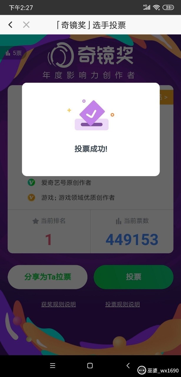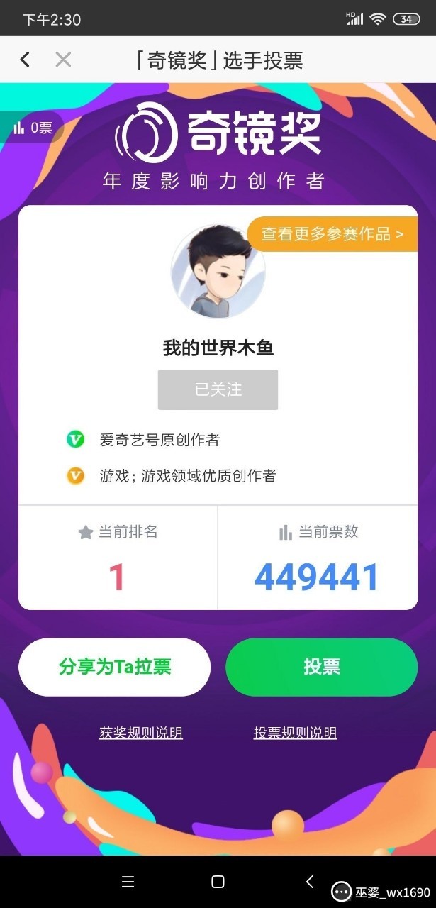 刁近几天梦诺我最爱的主播,参加了奇艺奖,请小伙伴们能为木鱼大大加油!投上宝贵的一票!谢谢!!!!