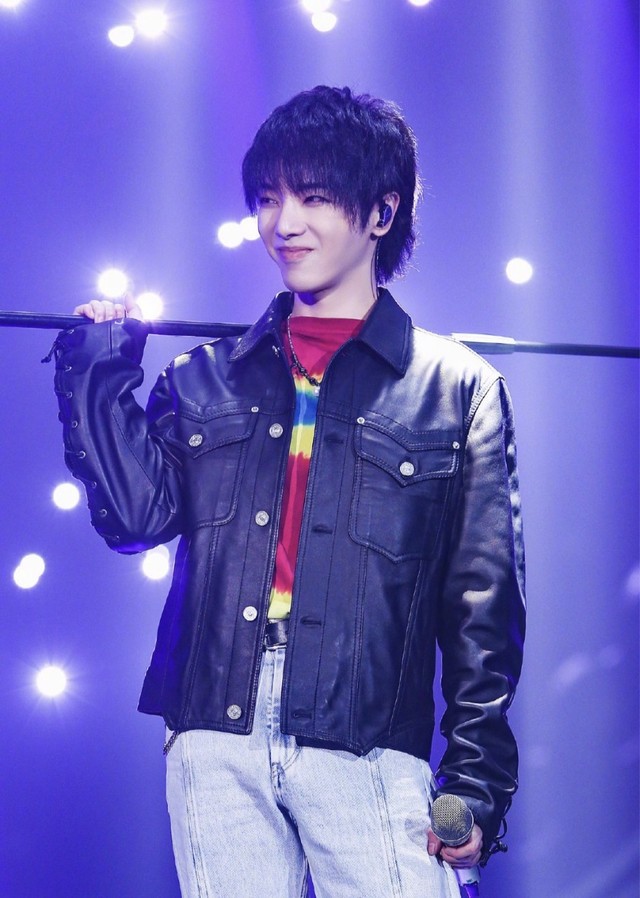 华晨抗拿着麦架从台下走下来,看那他嘚瑟的小眼神,因为唱完就可以休息(吃东西)啦~