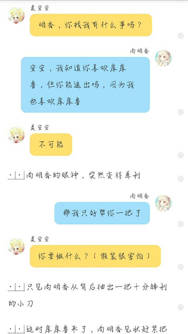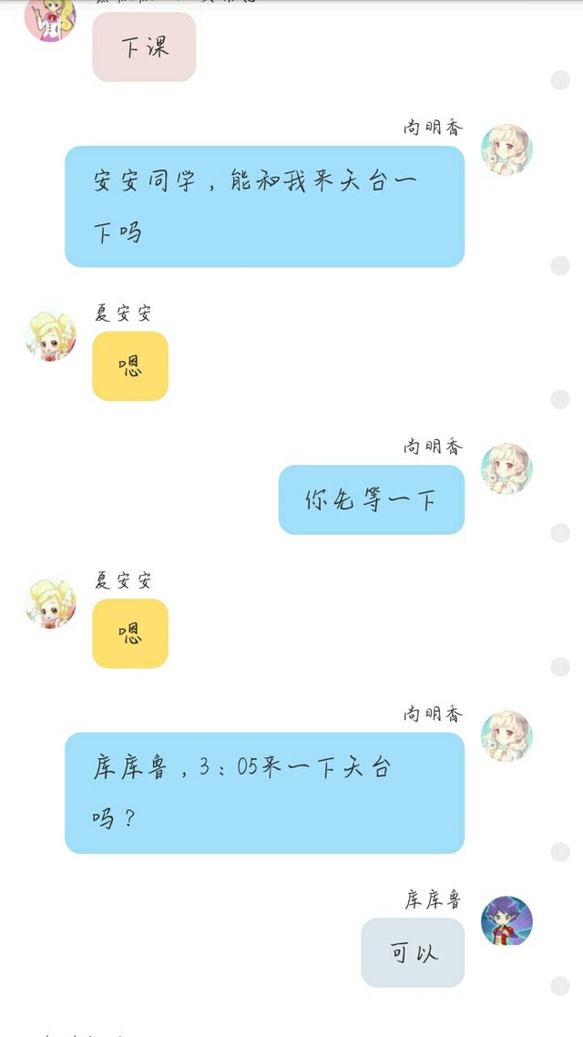 淼淼尚明香把夏安安约去天台然后假装夏安安刺伤了她然后被库库鲁看见然后成功误会夏安安。