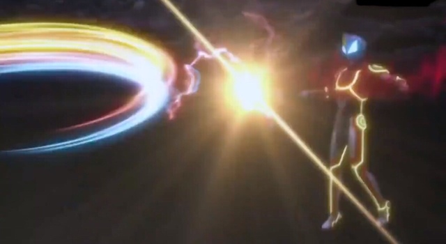艾克斯贝塔火花装甲[抓住自己的触手和钳子被飞过来的贝塔闪光剑切断,随后帮银河维克特利挣脱开触手和钳子]