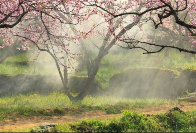 王默站在那里,被眼前的景象惊住了:粉红色的桃花簇拥在一起,留在曲折的深色的树枝上,每棵桃花树下都有一片草地,配在一起真是美丽。风吹来了,树上的桃花瓣飘落下来,地上一片粉,风也吹着那浅蓝色的长发,那穿着蓝色衣服的男孩侧过半脸,笑了,他的笑容这片桃花林一样美丽,她又一次心动了。